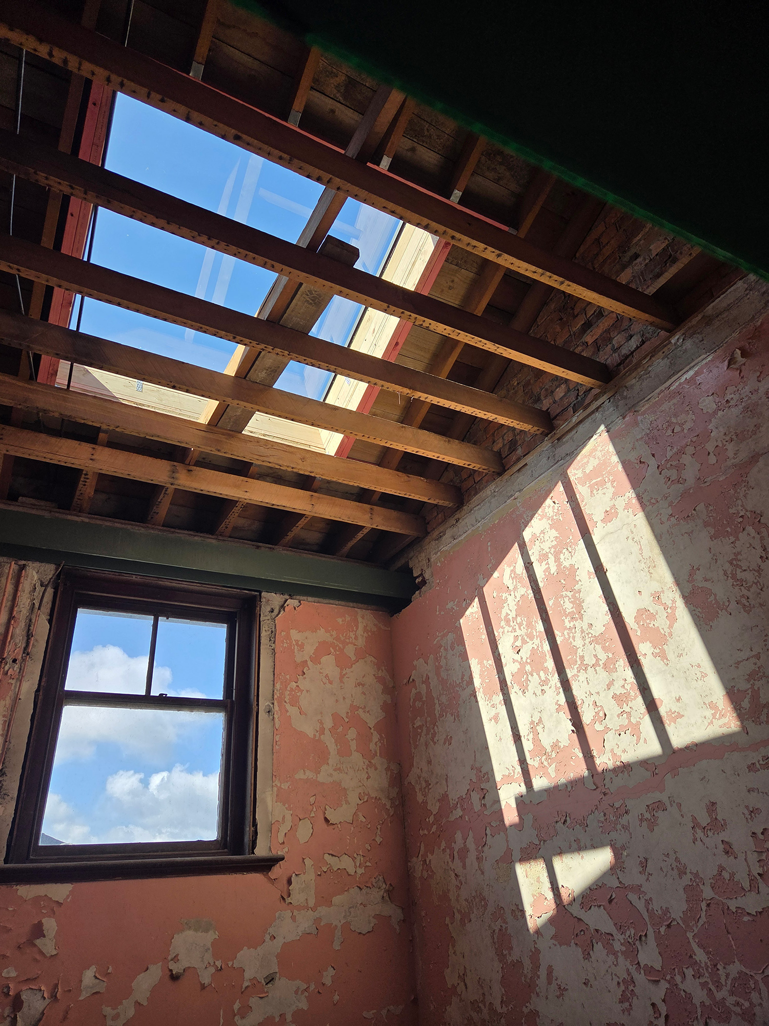 Architects' update December 2025: The first stage of the weathertightness and safety project is complete, so the building is now secure and stable until the full strengthening scheme can be completed. Stage 1 included re-roofing and replacing the rotten and leaky windows, so the building can dry out and stop the rot. The parapet and facades have been strengthened to improve public safety around the building. We have particularly enjoyed working closely with a local joiner/window fabricator – and heritage enthusiast – to replace the windows.